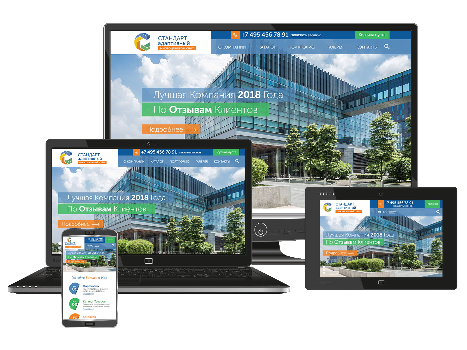 Адаптивный дизайн гарантирует удобство просмотра вашего сайта на любом экране. Отличное отображение на компьютерах, планшетах и смартфонах – без потери функциональности и привлекательности.